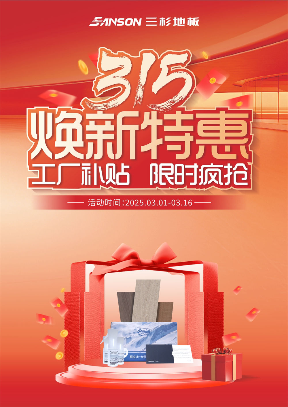 值此315焕新特惠季,三杉地板重磅推出一系列超值活动,以更实惠的价格、更优质的产品、更贴心的服务,真正为消费者发声,全方位守护消费者权益。无论是新房装修还是旧房改造,都能享受,让我们一睹为快!
